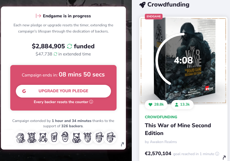 The Gamefound campaign for This War of Mine 2nd Edition is using something they call “Endgame” that extends the campaign each time someone adds a pledge (or something like that). They have a countdown to when the campaign will end (to nudge you to get something). However … they have that endgame countdown in two different places and as you can see in this side by side shot, the countdowns are not even close to matching!