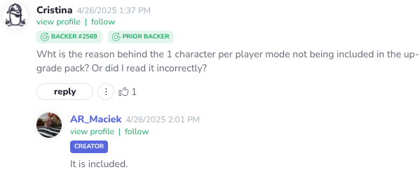 1 Character per Player module is included in the Upgrade Pack Confirmed by Awaken Realms: The 1 character per player mode **IS** included in the Upgrade Pack. Share this: Click to share on X (Opens in new window) X Click to share on Facebook (Opens in new window) Facebook Like Loading... Related Leave a comment Cancel reply Δ