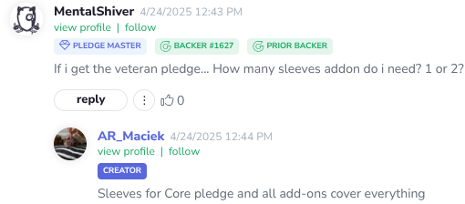 Sleeves included in Veterans Pledge cover all cards Confirmed by Awaken Realms: The Veterans pledge includes sleeves for ALL the cards. No need to buy any yourself. Share this: Click to share on X (Opens in new window) X Click to share on Facebook (Opens in new window) Facebook Like Loading... Related Leave a comment Cancel reply Δ