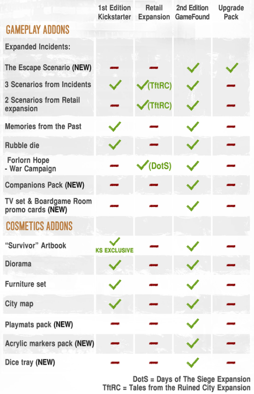 In their official Update #4, Awaken Realms provides a chart listing all the components that are part of the 1st Edition Kickstarter, 1st Edition Retail, 2nd Edition and the Upgrade Pack. Read the full update here: